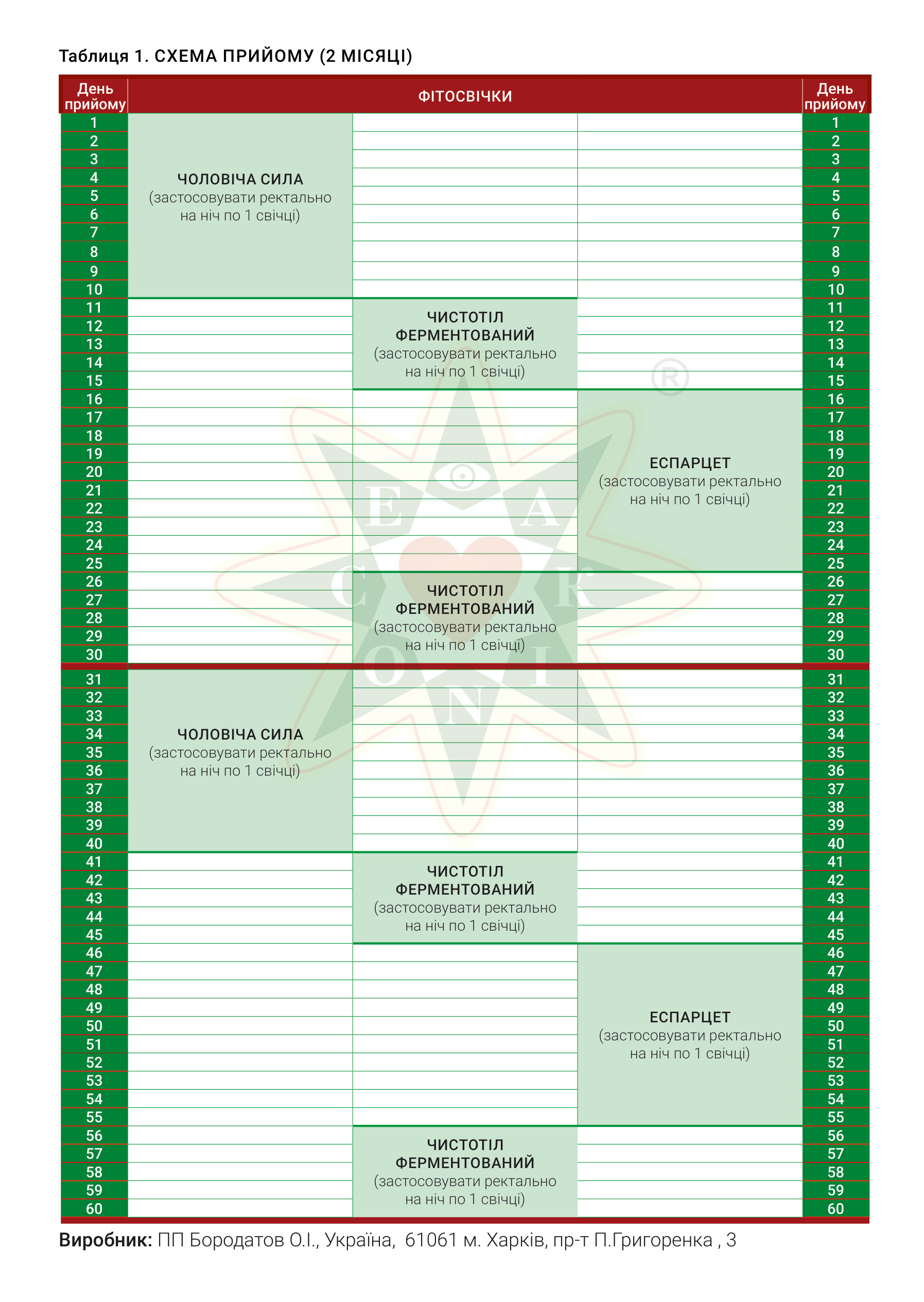 - Фітосвічки «Чоловіча сила» (склад 0,5г (g) композиція порошків ятришника, еспарцету, кореня лепехи (аїру), ромашки лікарської, хвоща польового екстрактів “Еконіка”; 0,05г(g) натурального масляного екстракту гарбуза; PEG 1500 до 1,3г(g) -2 упаковки;
